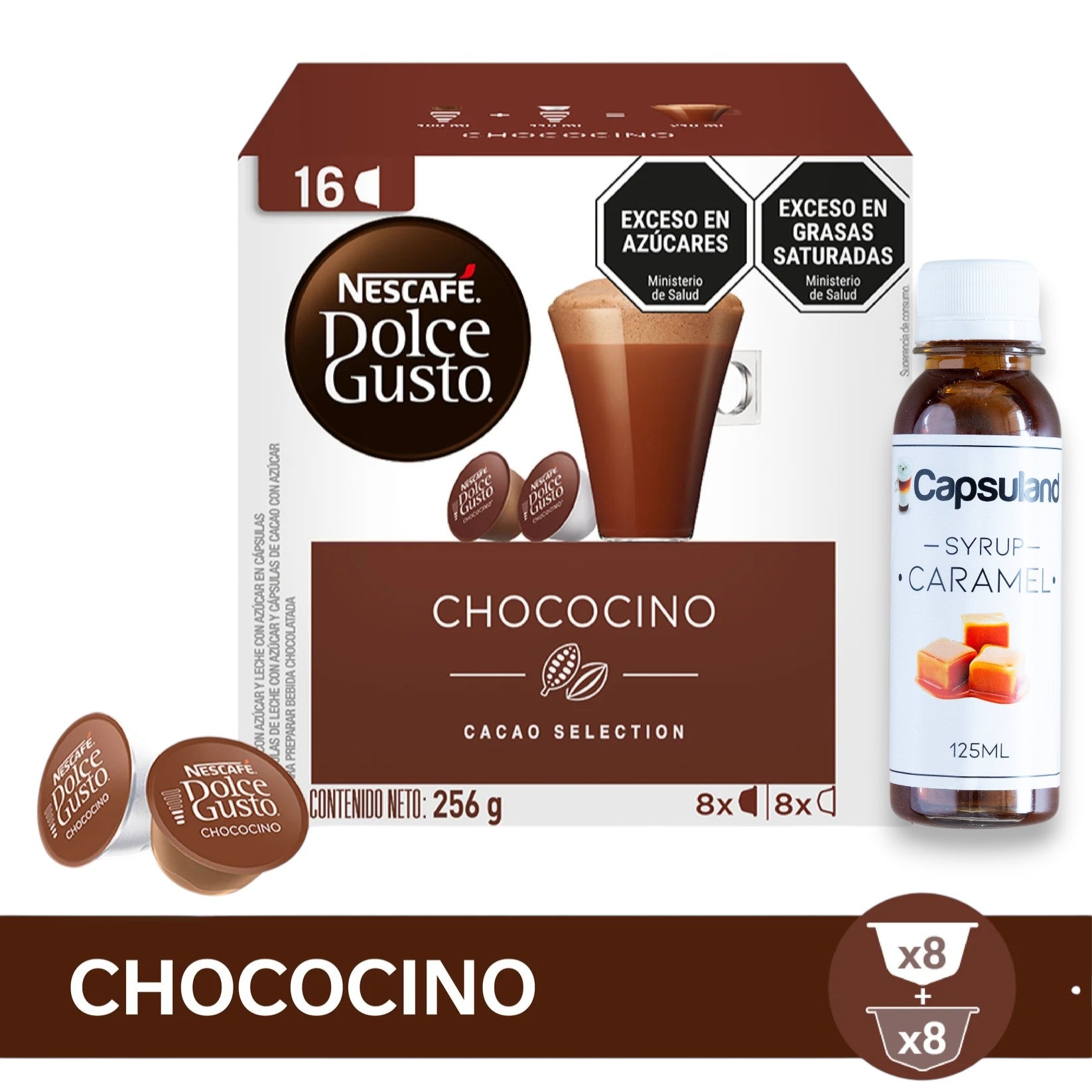 Esta promo contiene una caja x16 cápsulas de Chococino + 1 syrup 125 ML sabor caramelo